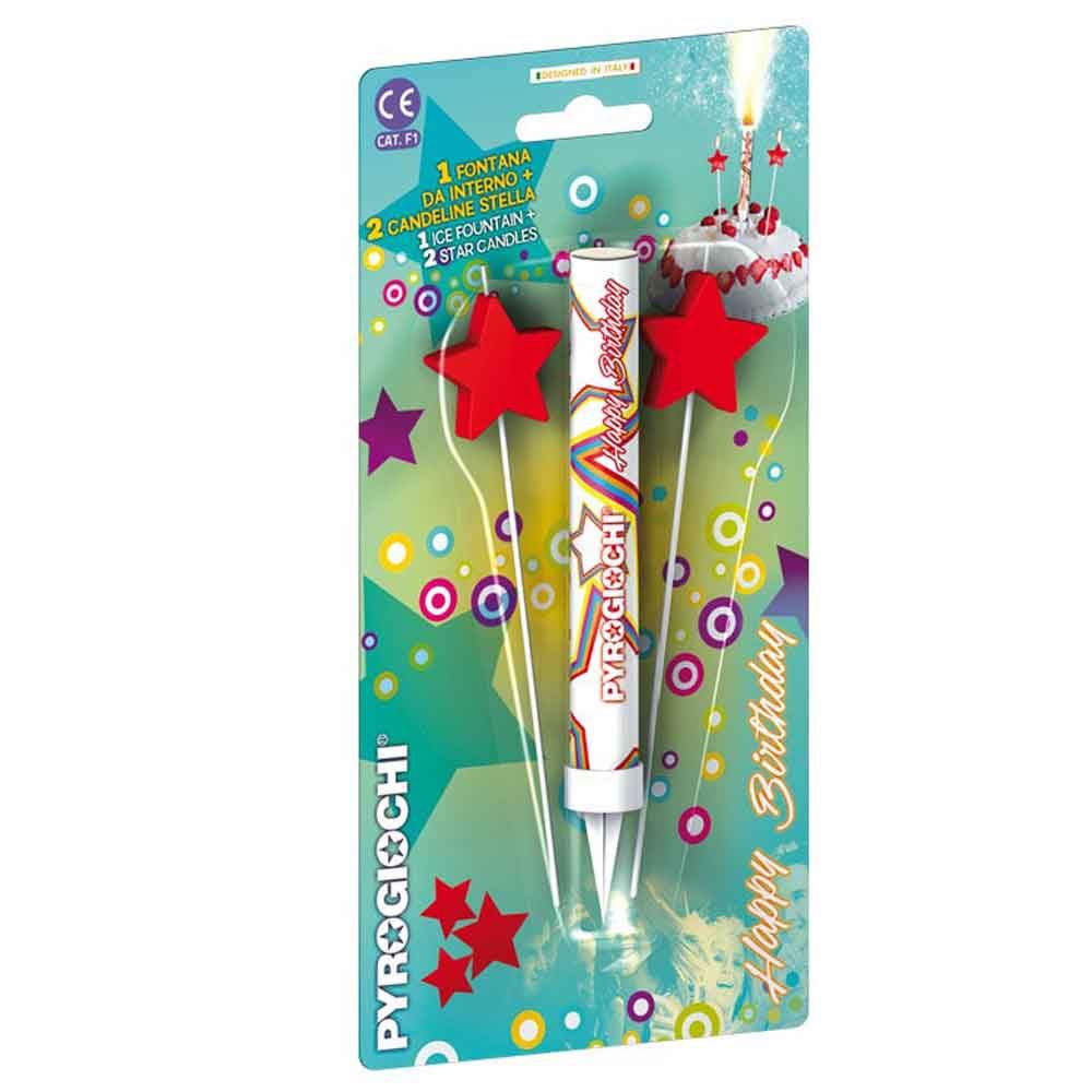 Porta allegria con la fontana pirotecnica per torte e 2 candeline sottili in cera con una stella rossa, perfette per rendere ogni momento più brillante e divertente!