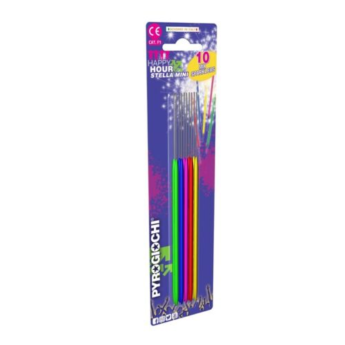 10 STELLE MINI MIX da 15,5cm, con bastoncino in metallo ricoperto di materiale che produce scintille luminose e bagno di colore fucsia, ,blu, verde e giallo. Sono confezionate in pratico blister salvaspazio. Le stelline sono pensate per un uso esterno e si spengono dopo aver consumato tutto il materiale autoestinguente. Le scintille prodotte sono di colore dorato. Stelline di libera vendita CAT. F1 con rischio potenziale molto basso. Tenere lontano dalla portata dei bambini, dalle parti del corpo e da materiali infiammabili.