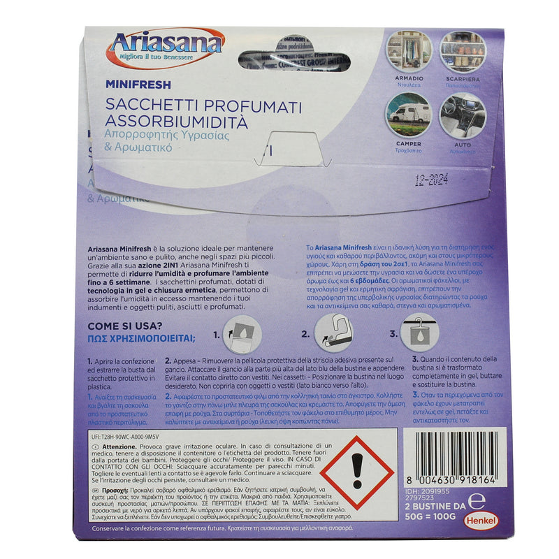 ARIASANA MINIFRESH RELAX GR.10 sono dei sacchetti usa e getta da 50g che oltre a controllare l'umidità, diffondono un profumo gradevole. Sono adatti a spazi molti piccoli e chiusi, fino a 1-2mq, come guardaroba, cassetti, armadietti e scarpiere. I Minifresh hanno una azione 2in1: le perle igroscopiche assorbono l'umidità trasformandola in gel e le perle profumate rilasciano una delicata e persistente fragranza che crea una speciale atmosfera in casa.