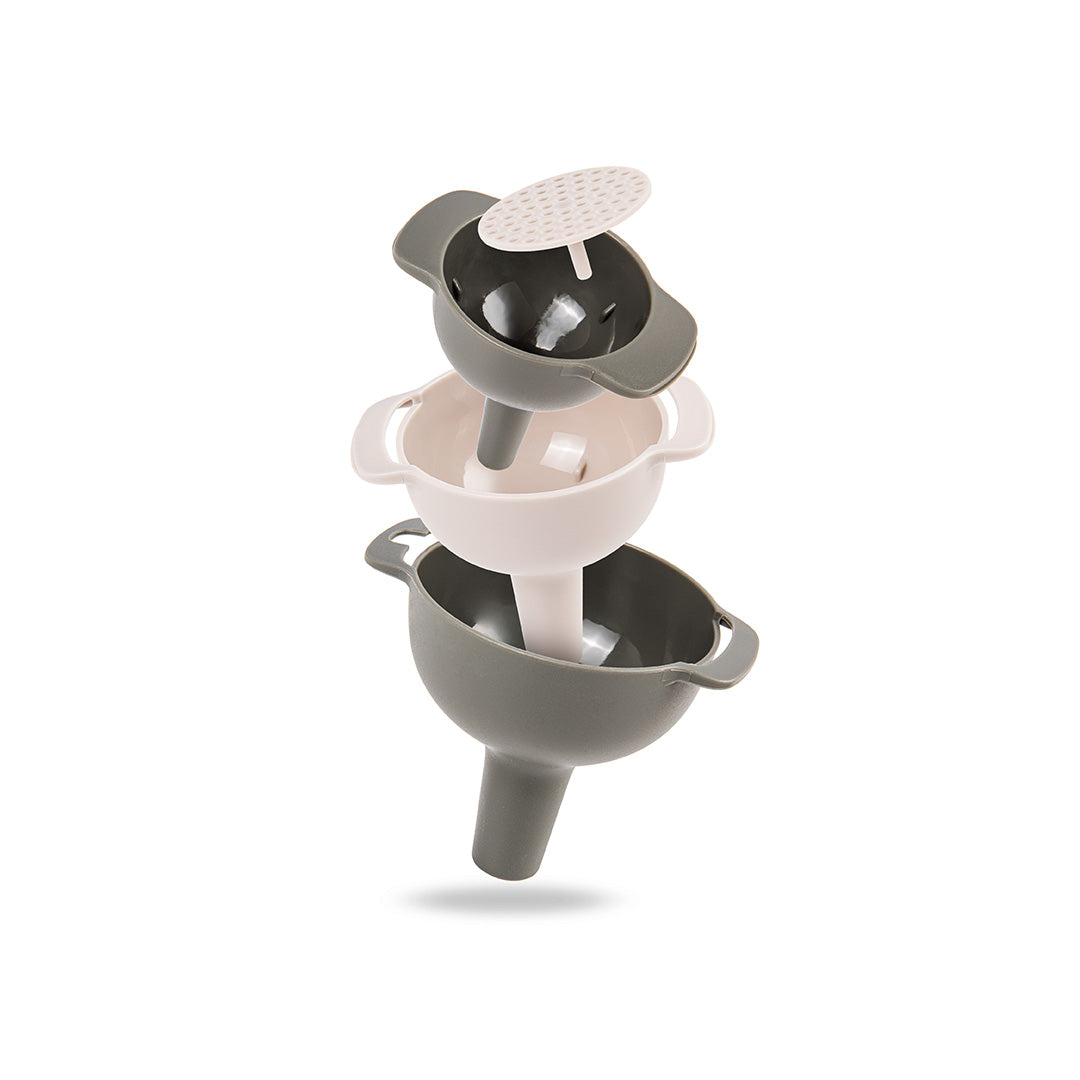 Utilissimo set di 3 imbuti di plastica per la casa, misure 6, 8 e 10 cm, tutti con filtro che previene il passaggio delle impurità.