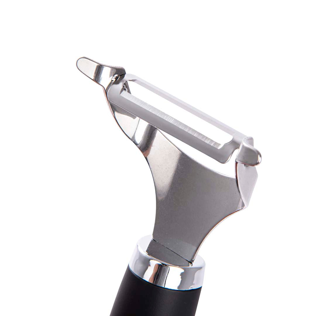 Pelapatate in acciaio DC CASA LINEA Black, misura 18.5x6.2 cm, progettato per garantire una pelatura efficiente e senza sforzo. Perfetto per una cucina moderna e funzionale, riesce a combinare robustezza e design elegante per facilitare le tue preparazioni quotidiane. Questo utensile è dotato di manico soft touch e di un pratico foro che consente di riporlo facilmente.