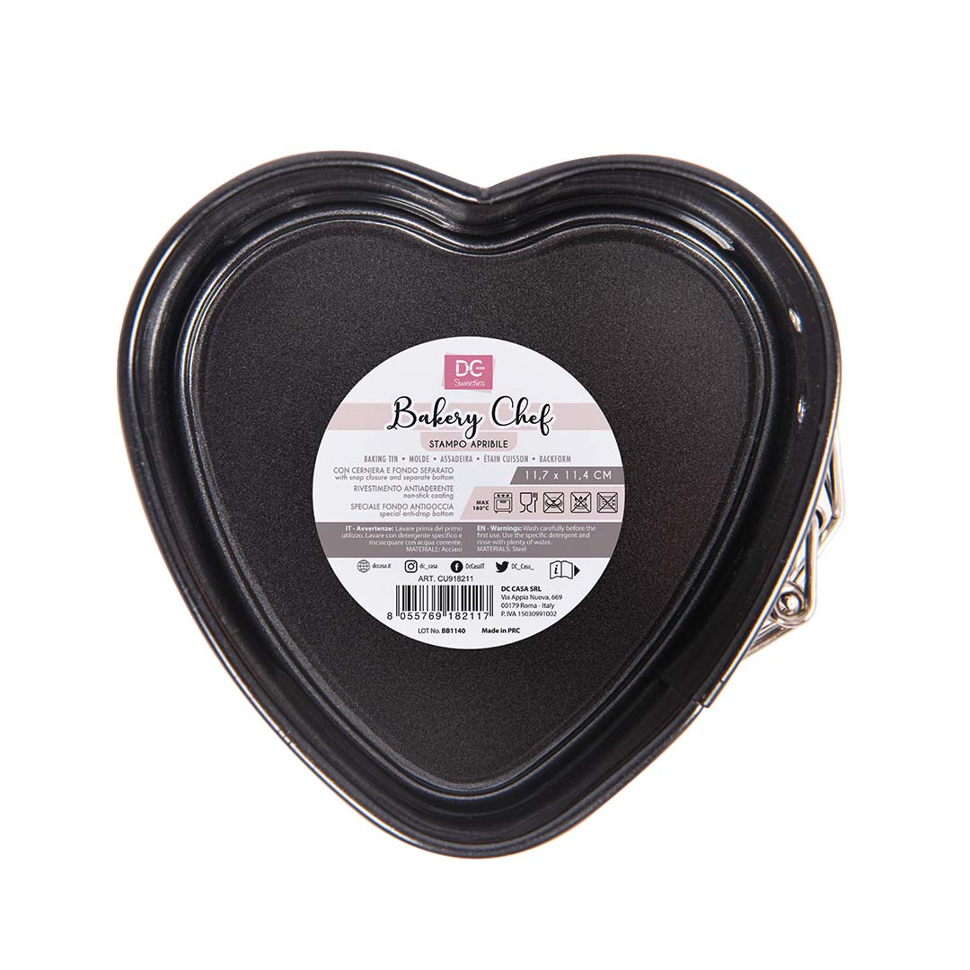 Mini tortiera da forno, antiaderente DC CASA, apribile, a forma di cuore, misura 11.7x11.4 cm. La cerniera laterale facilita l’estrazione dei dolci. Perfetta per dolcetti golosi e momenti di cucina divertenti!