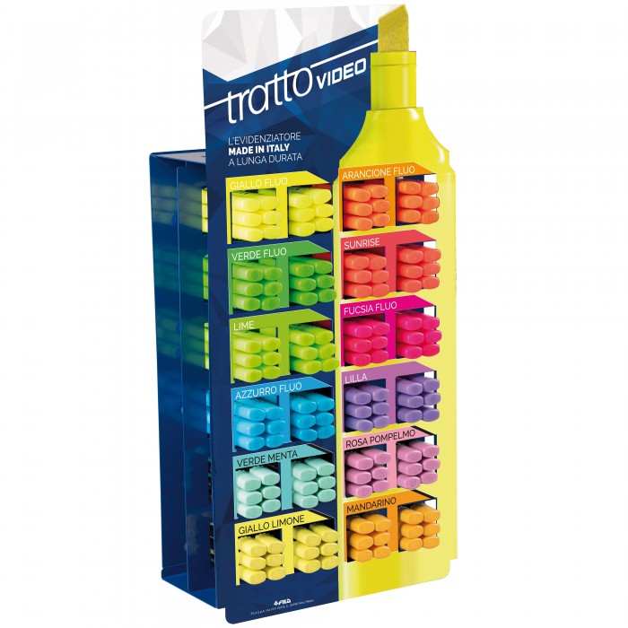 Sottolinea i tuoi appunti con i colori brillanti degli evidenziatori Tratto Video, ideali per mettere in risalto le informazioni più importanti con precisione e stile. Disponibili in un originale espositore da banco sagomato in metallo, appositamente studiato per presentare tutta la linea Tratto Video.
