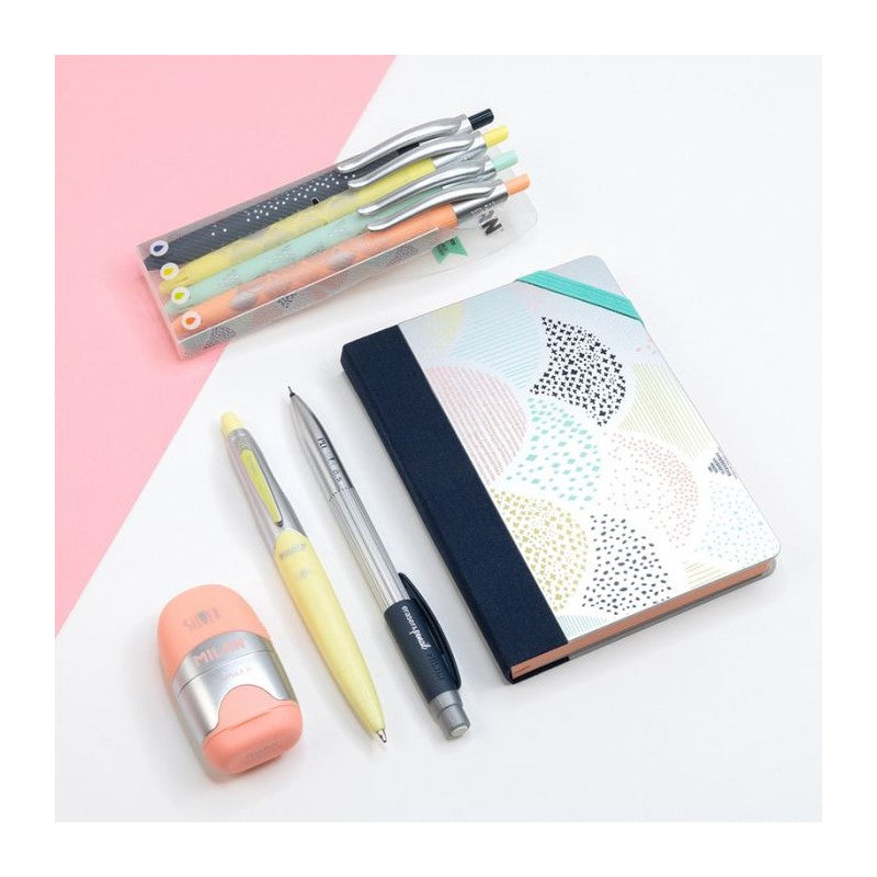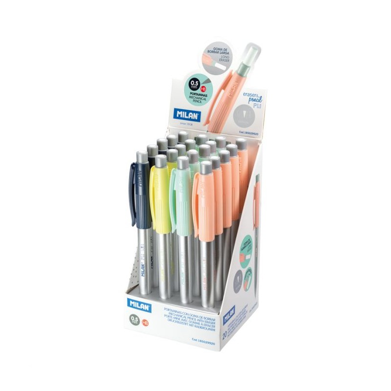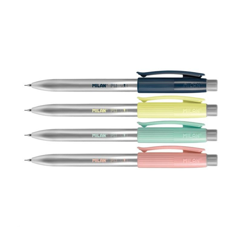 Matite meccaniche con mina in grafite HB da 0,5 mm, per linee sottili. Gomma MILAN extra lunga. Disponibile in argento, con quattro colori di accento: giallo, blu, rosa e turchese. Gomme e mine di ricambio. Scatola espositiva da 20 matite.