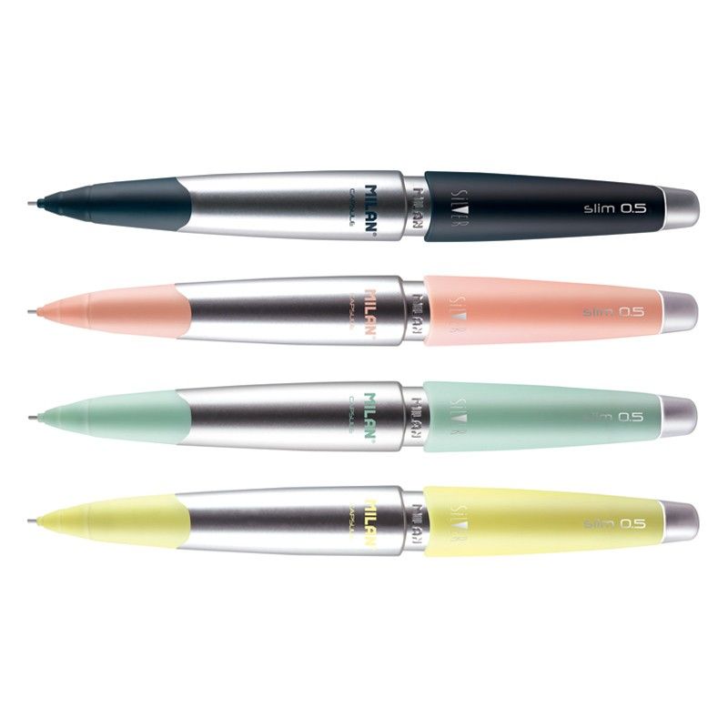 Matita meccanica con clip, con gomma extra lunga MILAN. Mina in grafite da 0,5 mm di durezza HB, adatta a disegnare linee sottili. Disponibile in 4 colori, abbinati a una finitura argento: blu navy, giallo, rosa, turchese. Confezionata in scatola espositiva da 20 matite.