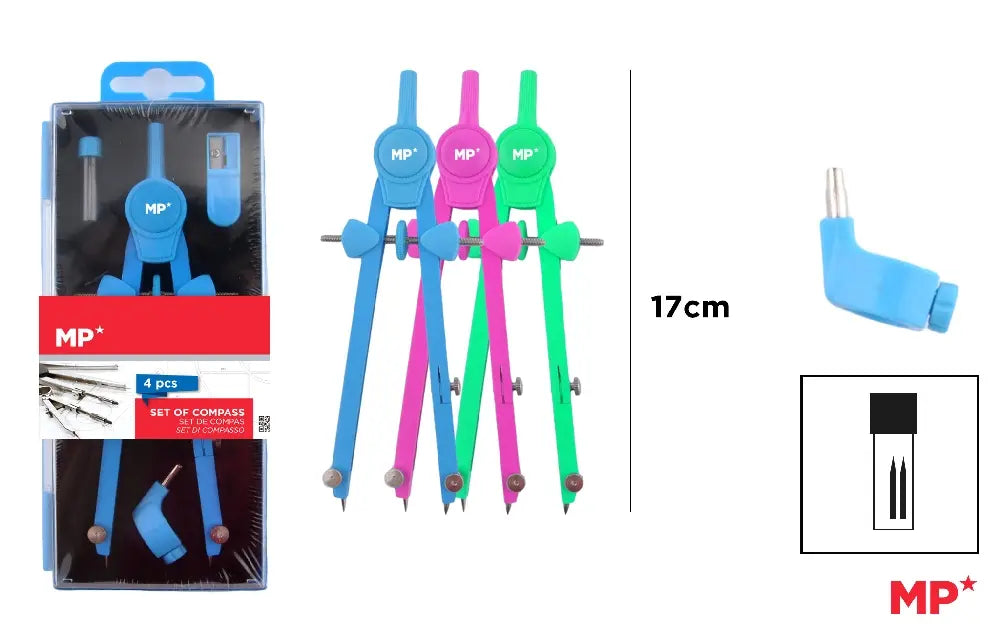 MP compasso BALAUSTRONE in custodia di plastica composta da: adattatore per pennarello, astuccio per mine e ricarica per mine. Disponibile in 3 colori assortiti: blu, rosa e verde.