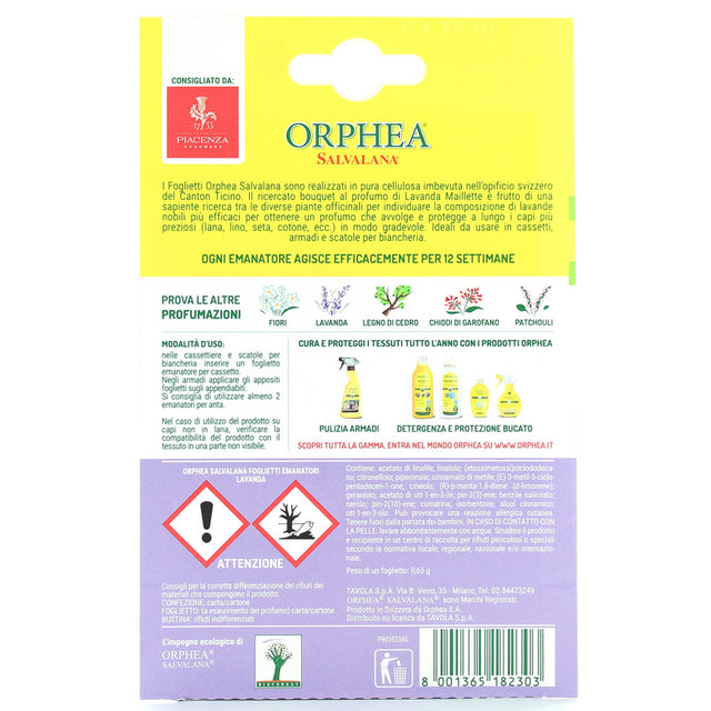 ORPHEA SALVALANA al profumo di Lavanda Maillette, sono foglietti in pura cellulosa, ideali per proteggere e profumare i tuoi capi. Offrono una fragranza delicata e persistente di lavanda. Pezzi 12.