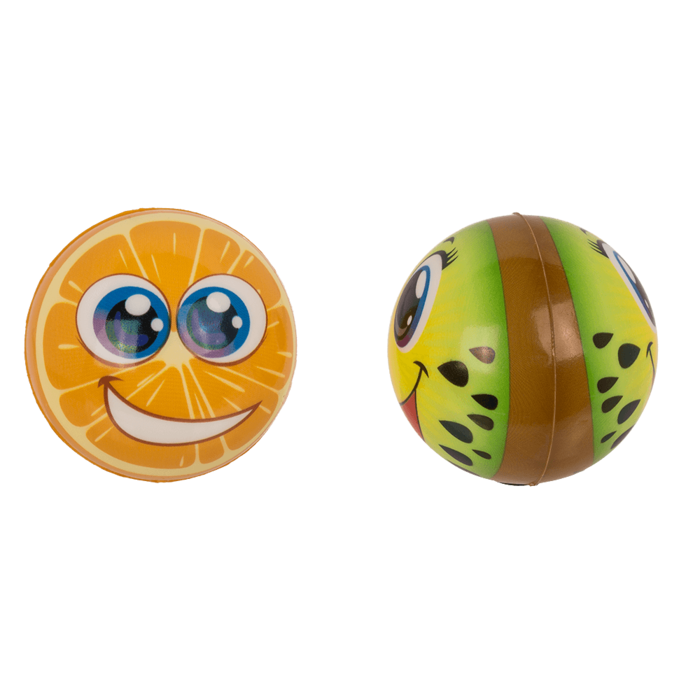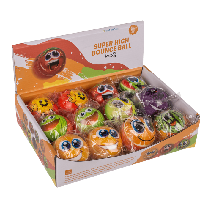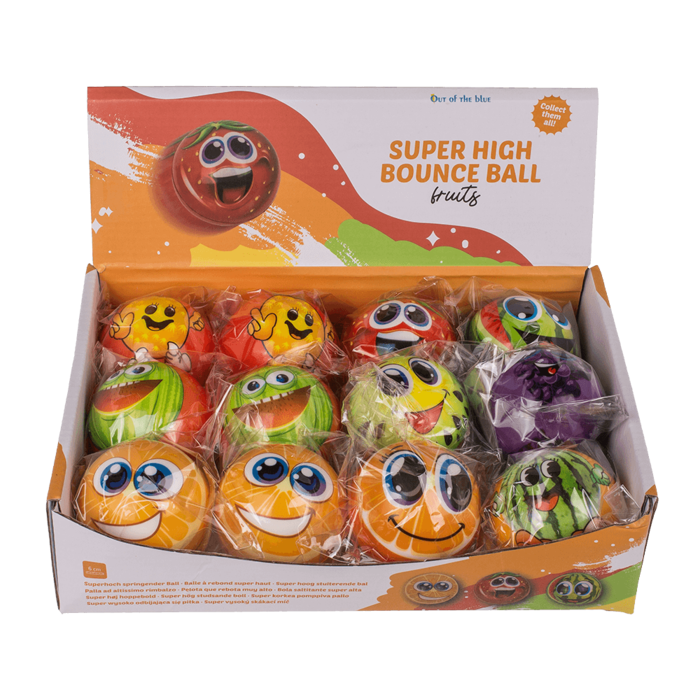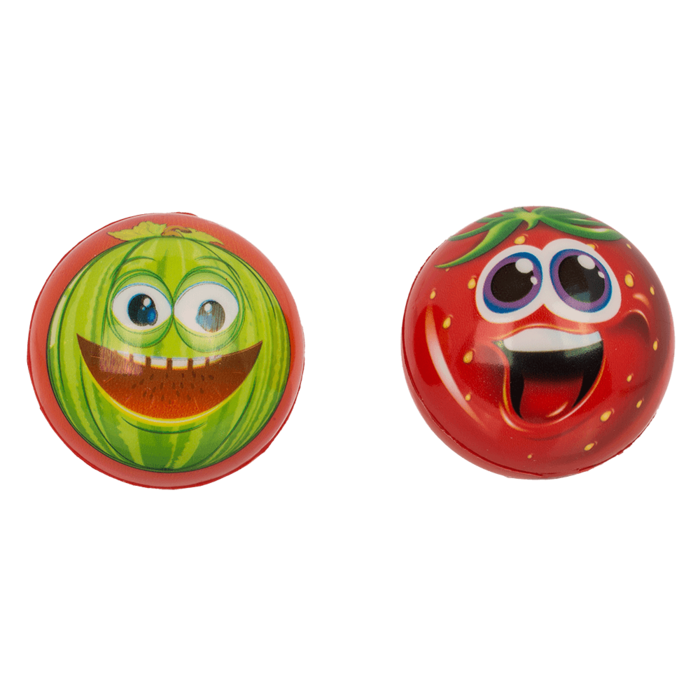 Palla rimbalzante con motivo frutta, diametro circa 6 cm. Disponibile in 9 varianti assortite. La confezione è da 12 pezzi. Perfetta per divertirsi ovunque grazie al suo rimbalzo eccezionale.