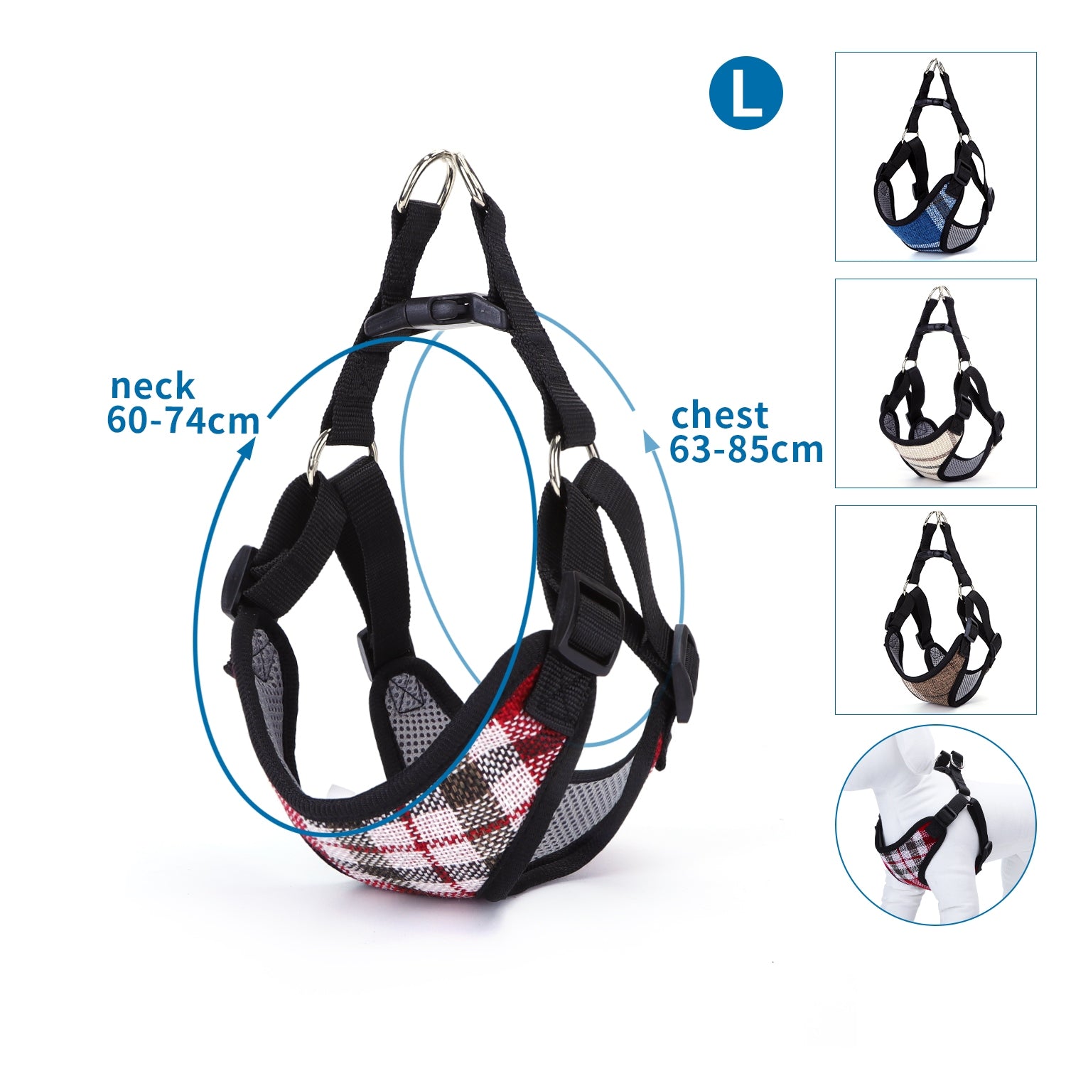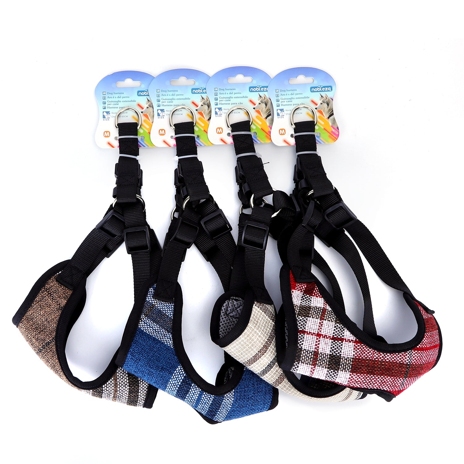 Pettorina in tela con collo regolabile da 60 a 74 cm e torace da 63 a 85 cm, disponibile in quattro varianti assortite. Perfetta per garantire comfort e sicurezza al tuo animale durante le passeggiate.