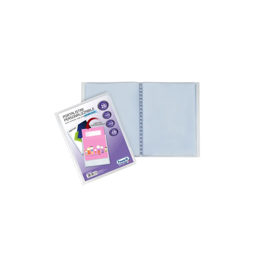 Portalistini FAVORIT, realizzati in polipropilene con copertina flessibile e trasparente con tasca per la personalizzazione. (20 buste interne con finitura liscia ultra trasparente)
