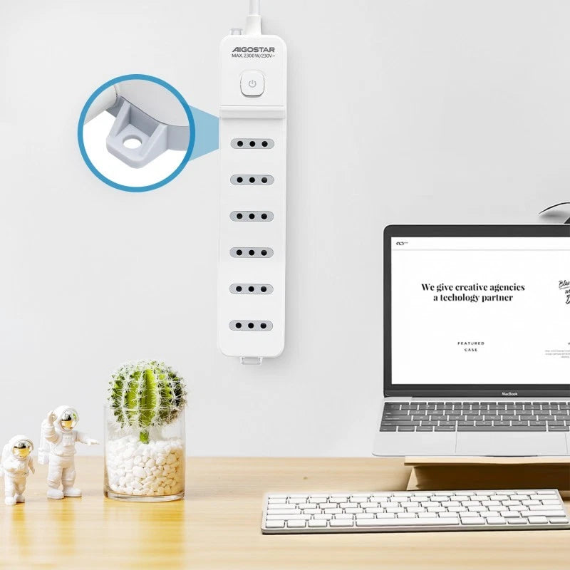 Multipresa a 6 posizioni con interruttore integrato, dotata di spazio tra le prese di 5 mm e capacità massima di 2300W. Ideale per gestire facilmente e in sicurezza più dispositivi contemporaneamente.