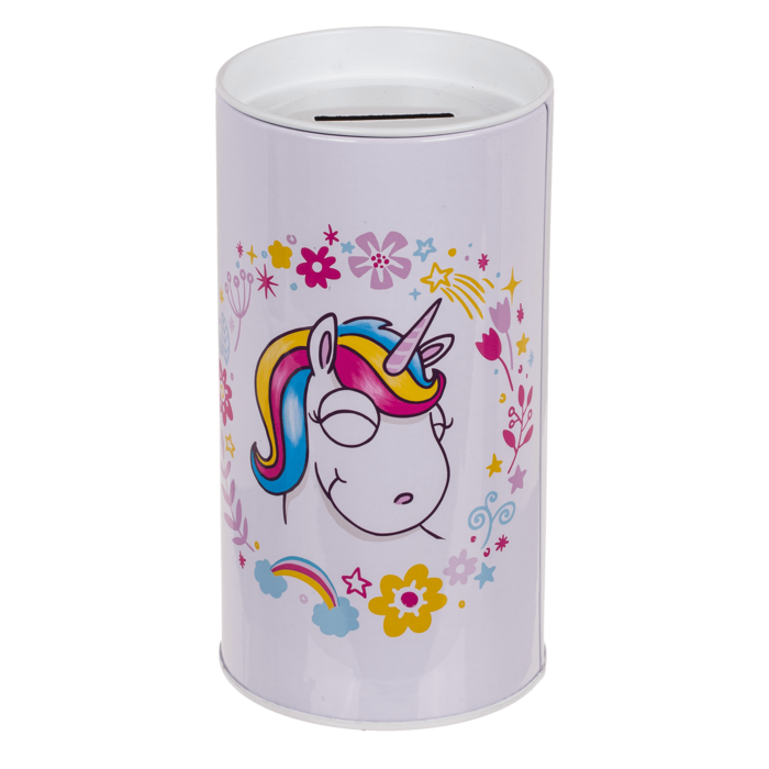 Salvadanaio in metallo a tema unicorno, misura 15,5 x 8 cm, con coperchio per proteggere i tuoi risparmi. Perfetto per i bambini che imparano così il valore dei soldi!
