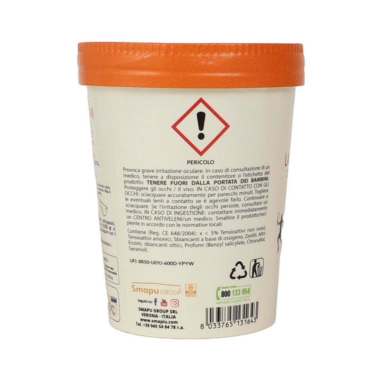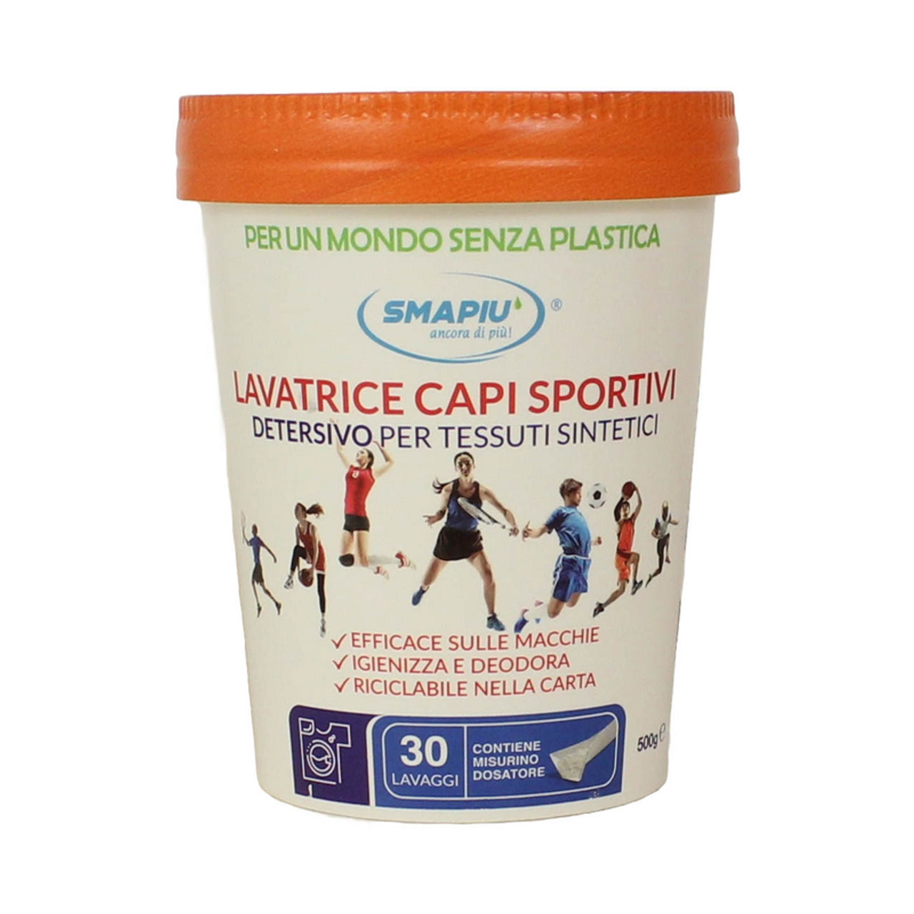 Smapiu lavatrice per capi sportivi. Un detersivo in polvere specifico per tessuti sintetici e tecnici sia bianchi che colorati. Confezionato in un pratico cestello totalmente plastic free da 500gr. Sono previsti 30 lavaggi.